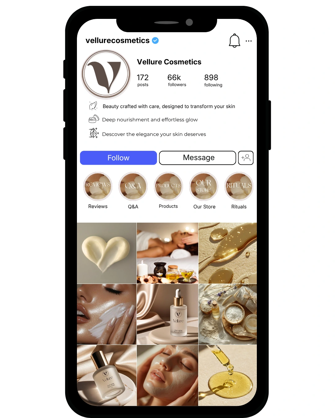 We defined Vellure as a sensorial luxury skincare brand — rooted in natural ingredients but elevated through refined aesthetics and strategic visual restraint.